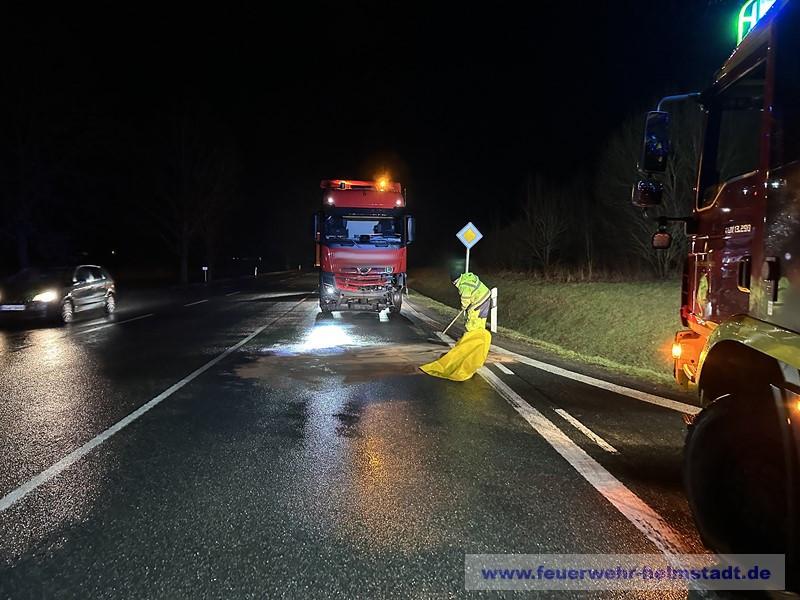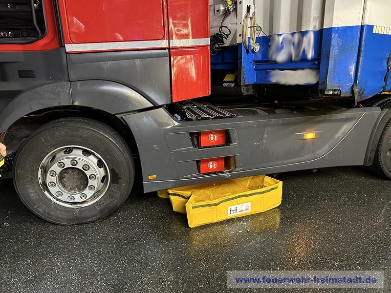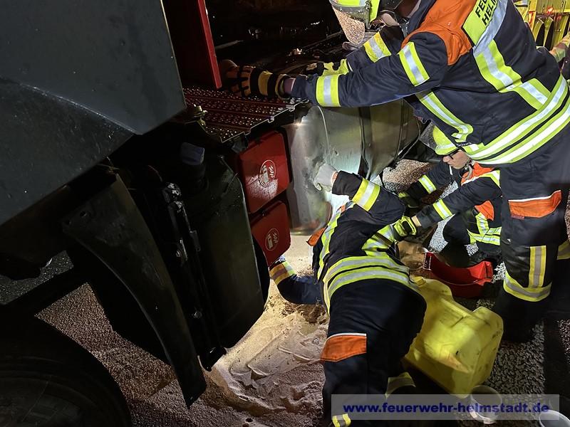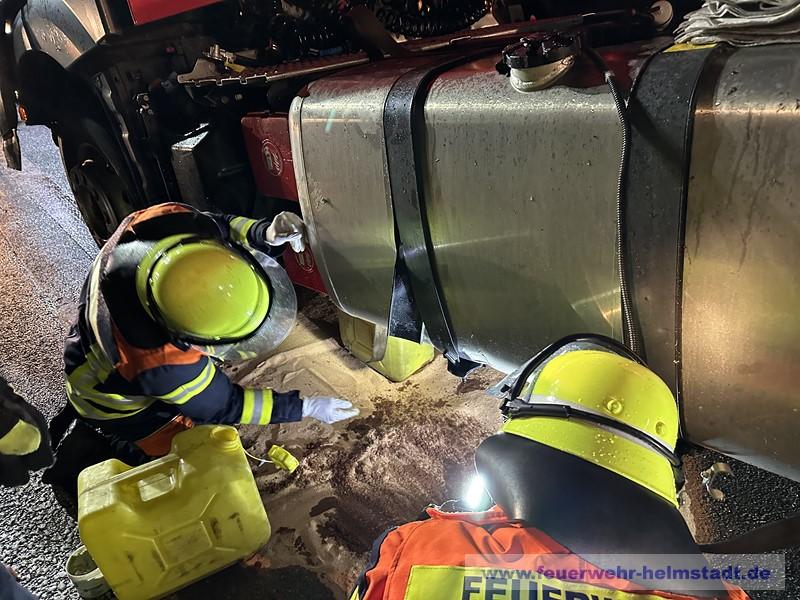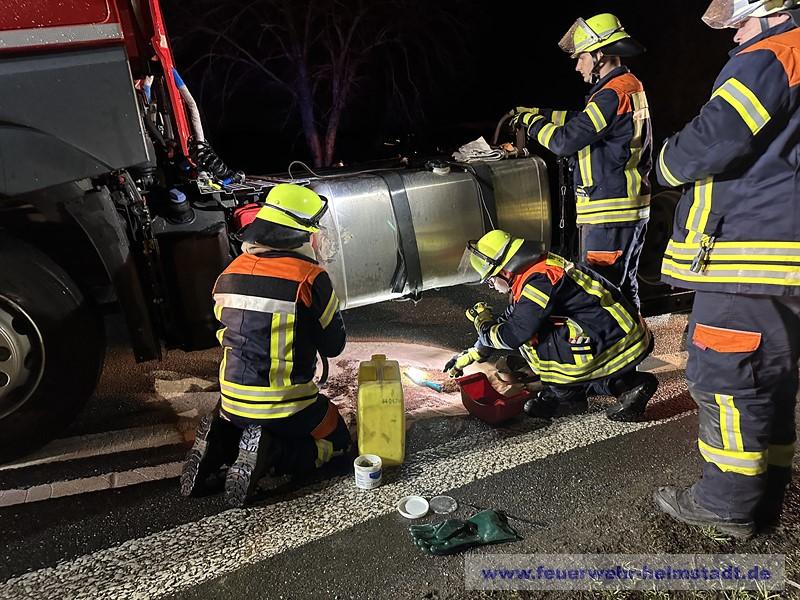 Die Feuerwehr wurde zu einem LKW alarmiert. Der Diesel-Tank hat leckgeschlagen und Kraftstoff trat aus. Die Einsatzstelle wurde abgesichert und ausgeleuchtet. Das Leck im Tank wurde abgedichtet. Ausgelaufener Kraftstoff wurde abgebunden und die Fahrbahn gereingt.