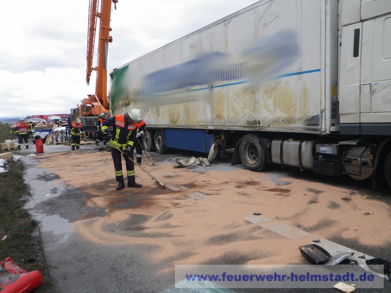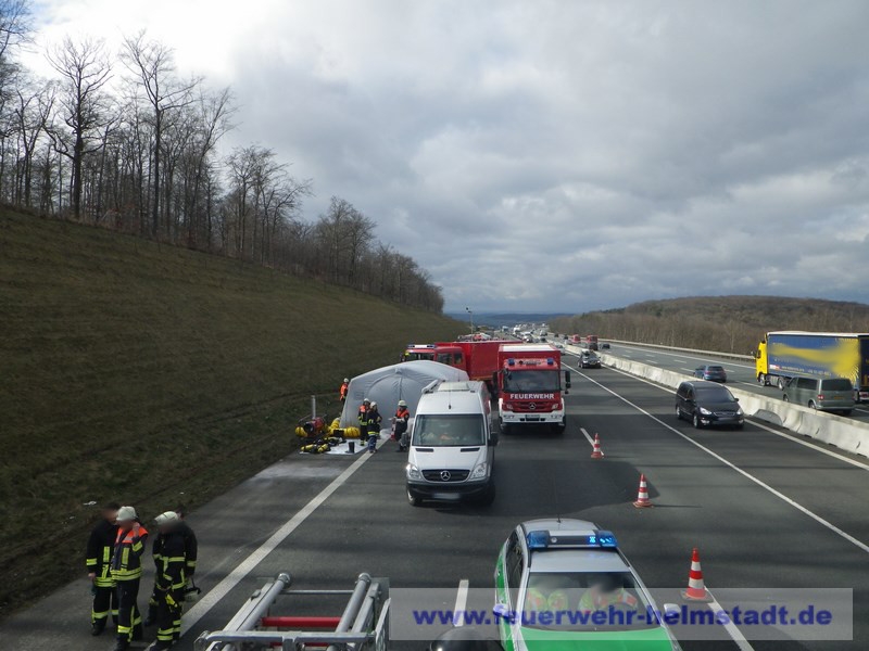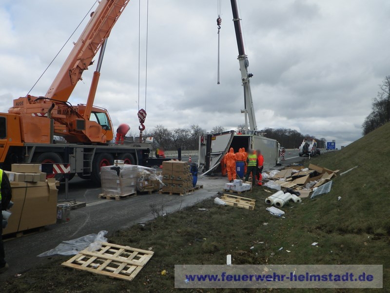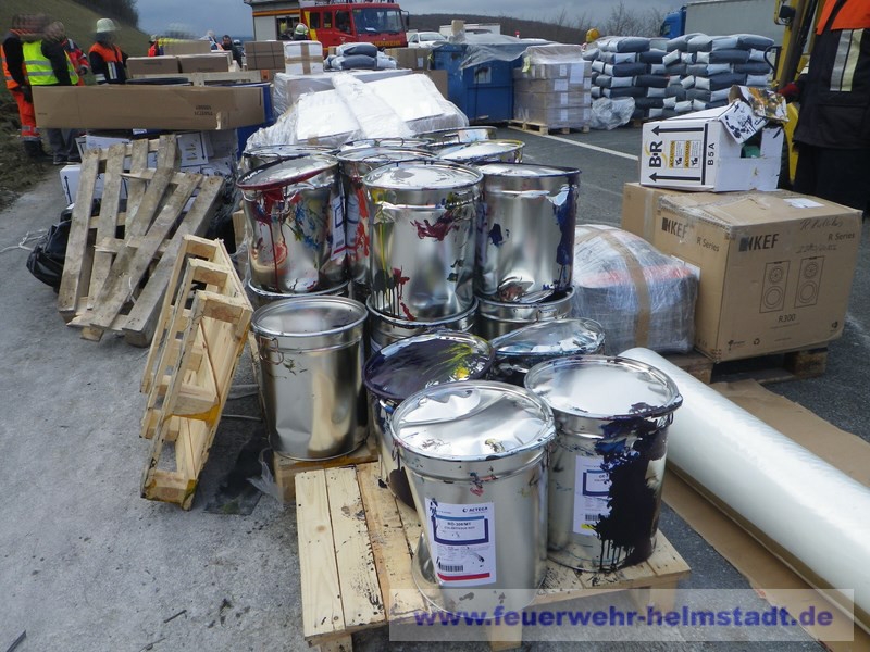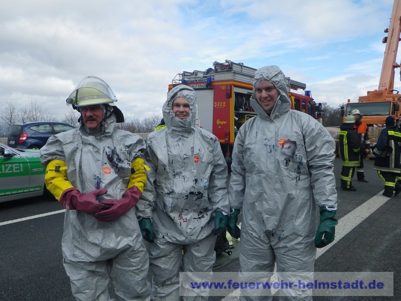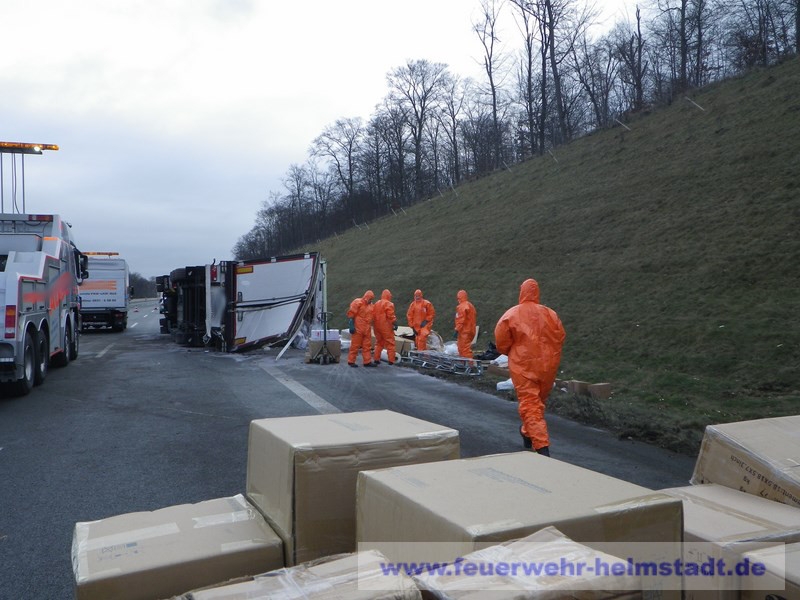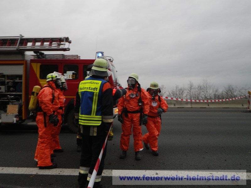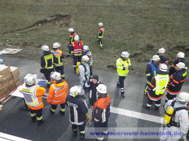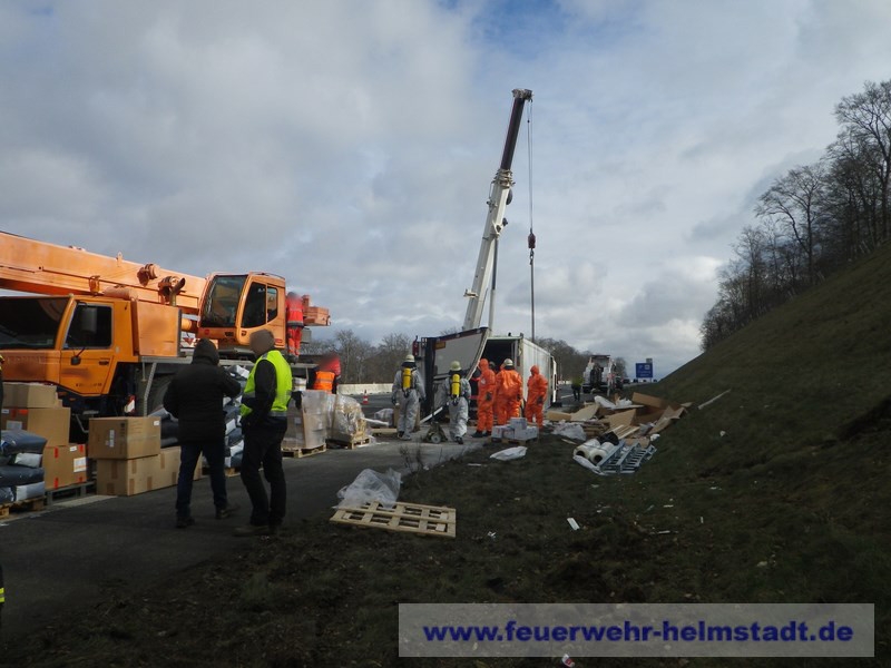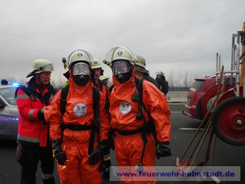 Auf der BAB 3 wurde ein Verkehrsunfall mit LKW gemeldet. Beim eintreffen der ersten Einsatzkräfte wurde die Unfallstelle abgesichert, ausgelaufene Betriebsstoffe abgebunden und die Ladungspapiere kontrolliert. Der 40 Tonner hatte Stückgut mit gefährlichen Stoffen geladen. Daraufhin wurden weitere Kräfte alarmiert. Unter umluftunabhängigen Atemschutz mit Schutzanzügen wurden der LKW ausgeladen und auf austretende Stoffe kontrolliert.
