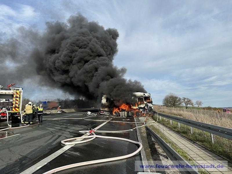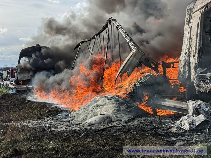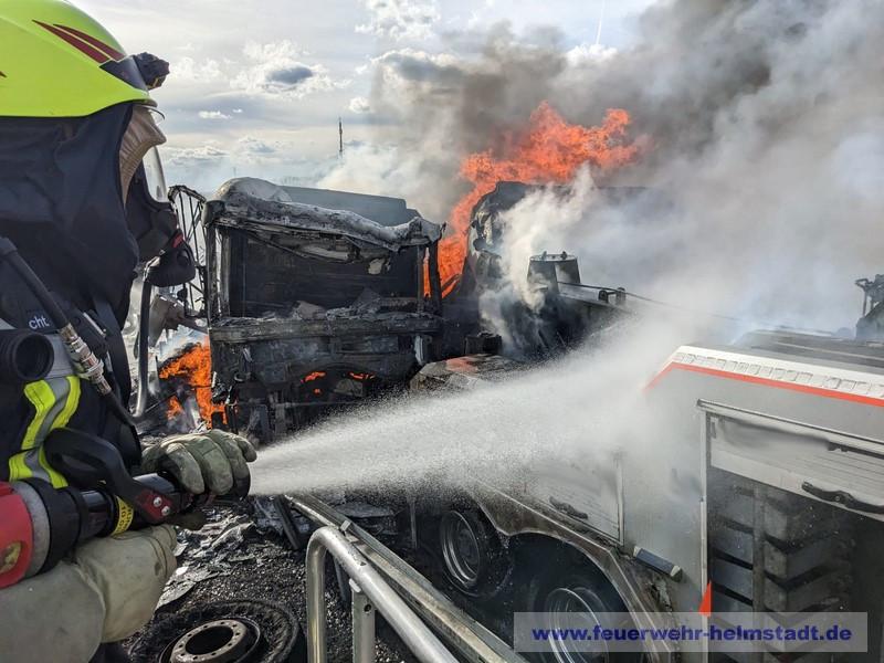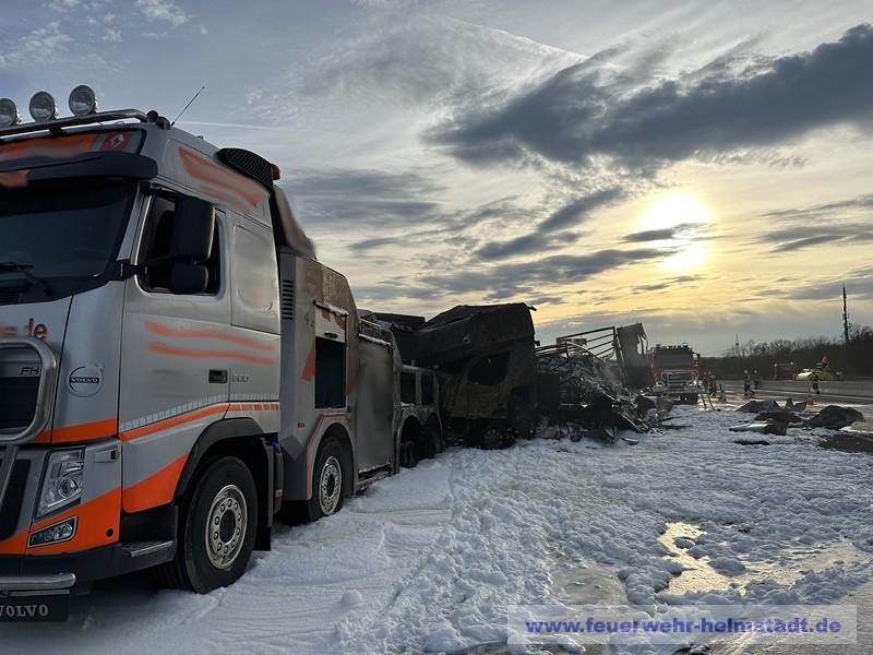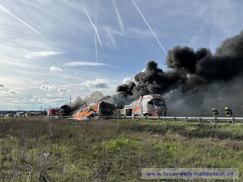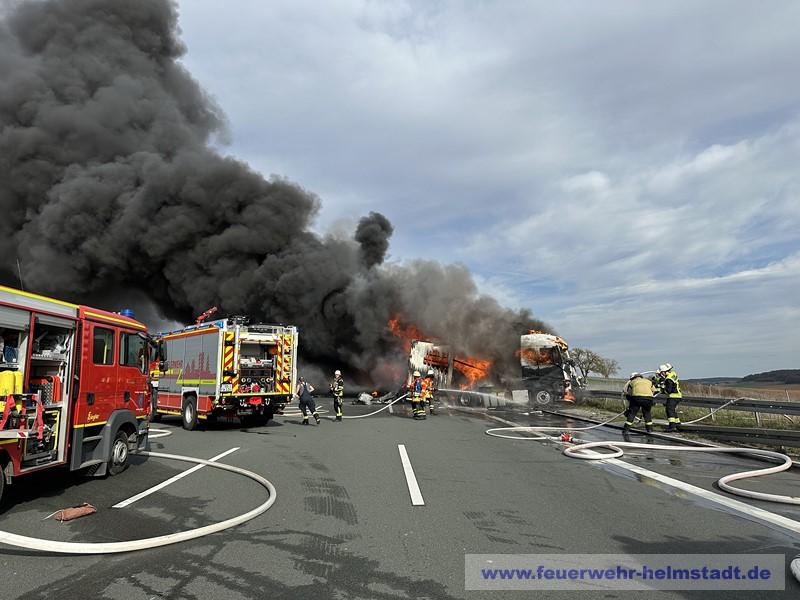 Die Feuerwehr wurde zu einem Verkehrsunfall mit mehreren brennenden LKWs alarmiert. Die starke Rauchentwicklung war während der Anfahrt zur Einsatzstelle weit sichtbar und es wurden durch die Lage auf Sicht weitere Wasserführende Fahrzeuge in der ILS angefordert.