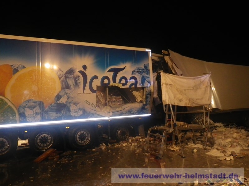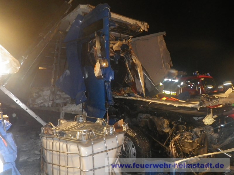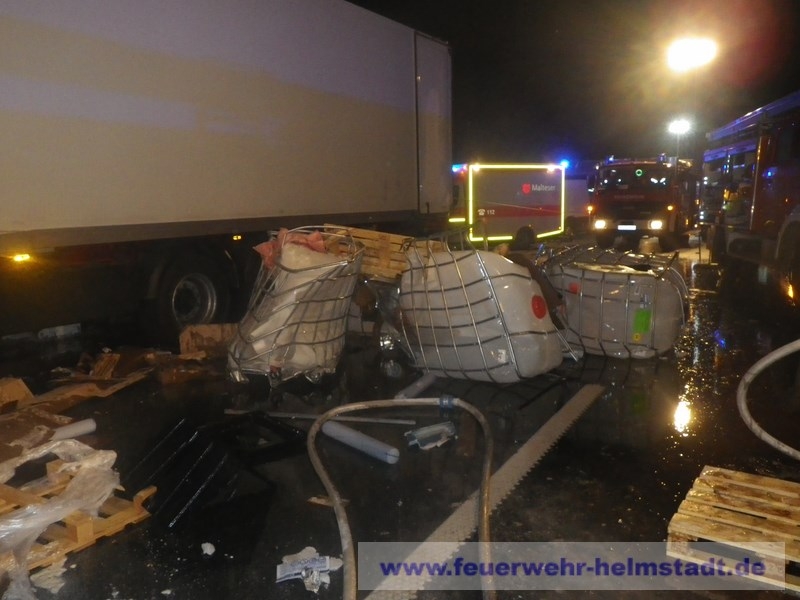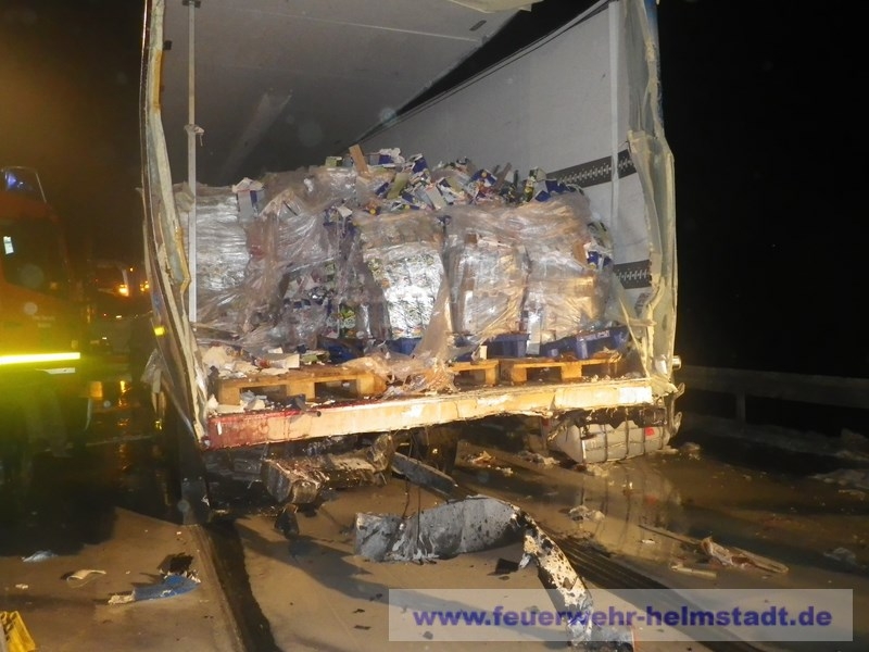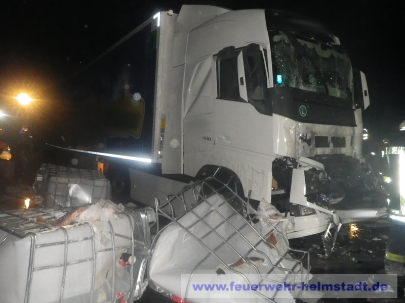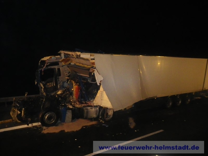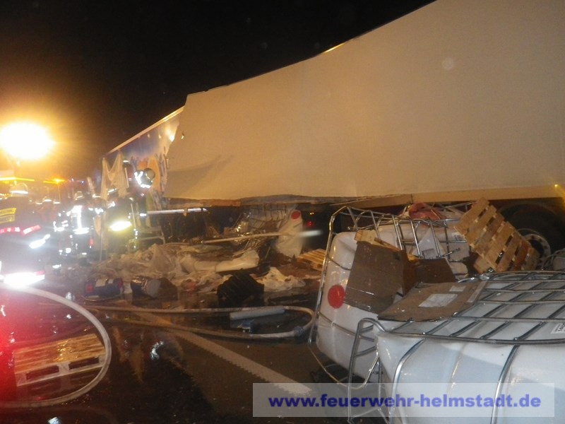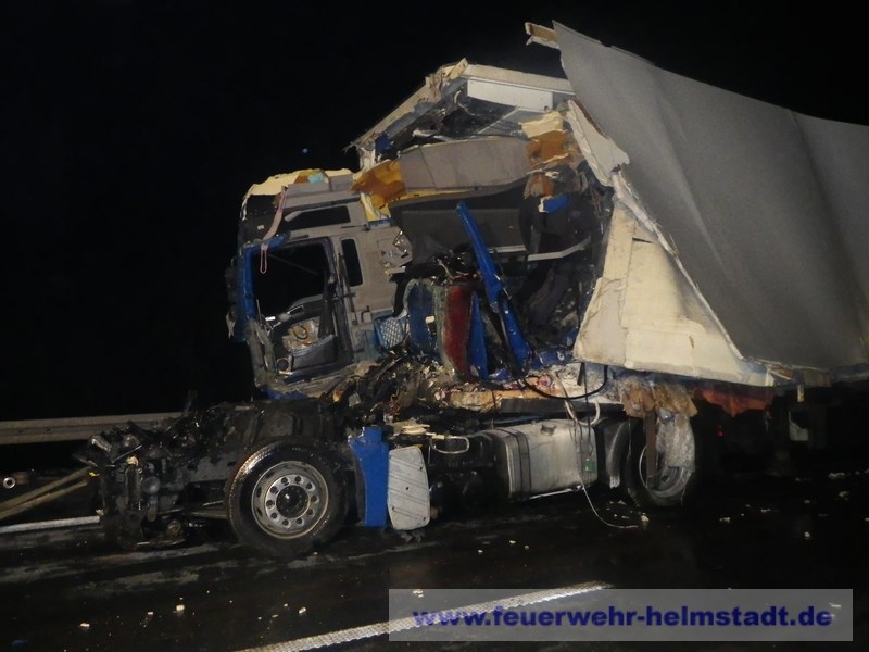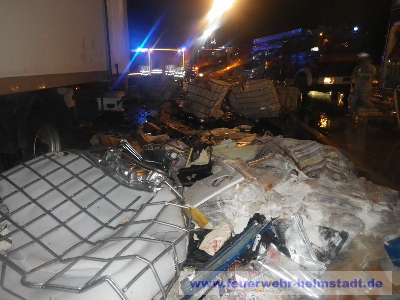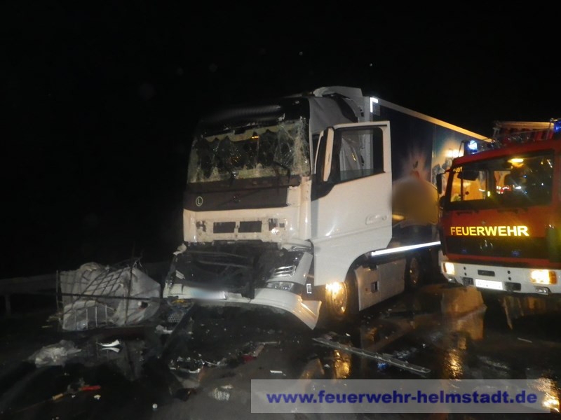 Zu einem schweren Verkehrsunfall mit vier beteiligten LKW wurden mehrere Feuerwehren auf die BAB 3 alarmiert. Die Unfallstelle wurde ausgeleuchtet und BAB 3 komplett gesperrt. Ein Fahrer wurde bei dem Unfall in seinem stark deformierten Führerhaus eingeklemmt. Durch die Feuerwehr wurde von zwei Seiten ein Zugang zum Fahrer geschaffen. Leider konnte ein Notarzt nur den Tod des Fahrers feststellen. Auslaufende Betriebsstoffe und Flüssigkeiten der Ladung wurden abgebunden. Nach der Unfallaufnahme durch Polizei und einen Sachverständigen wurde der Fahrer geborgen und die Fahrbahn gereinigt.