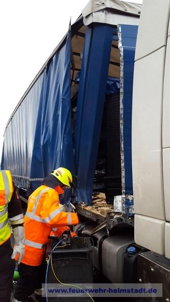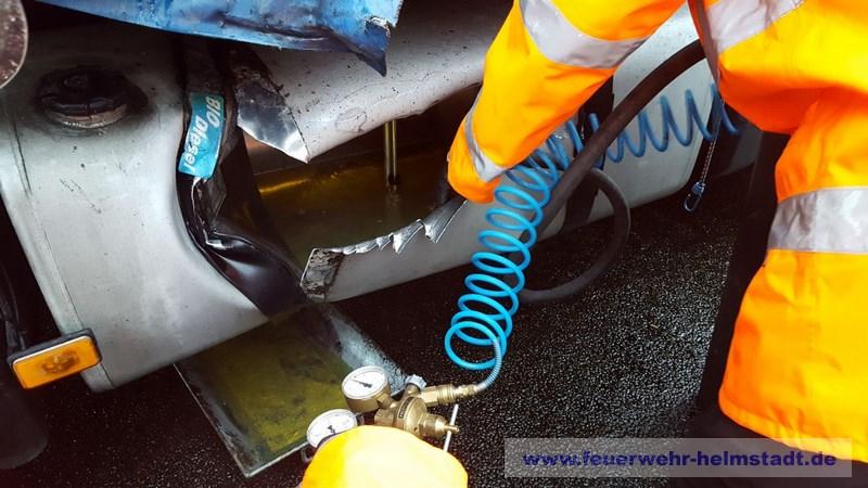 Nach einem Verkehrsunfall verlor ein LKW eine große Menge Diesel. Die Einsatzstelle wurde abgesichert und der Tank abgepumpt. Die Fahrbahnreinigung übernahm eine Spezialfirma.