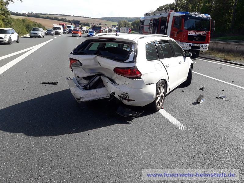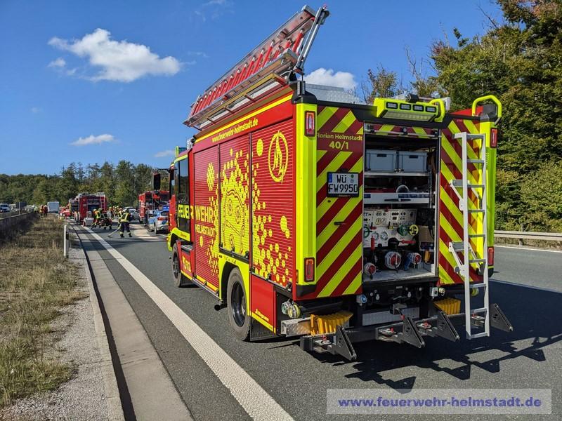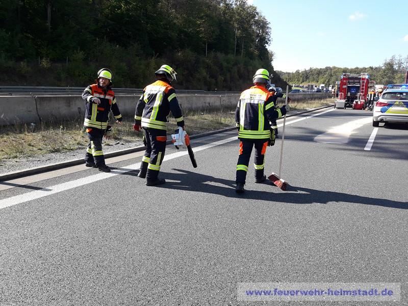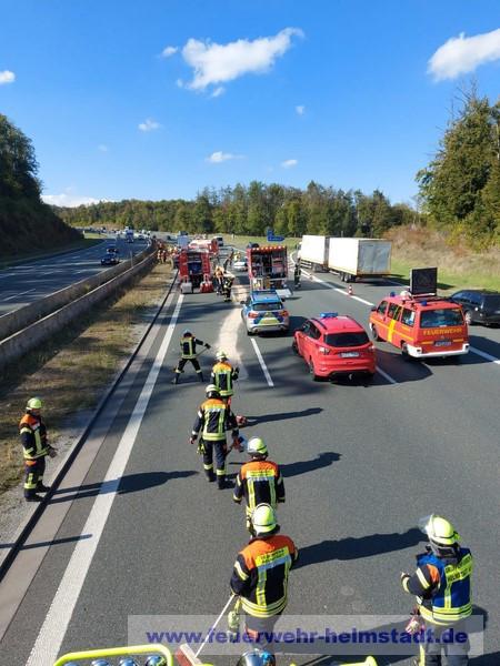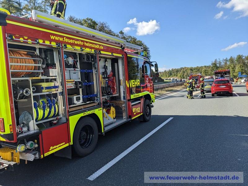Die Feuerwehr wurde zu einem Verkehrsunfall mit mehreren beteiligten Fahrzeugen auf die BAB 3 alarmiert. Die Einsatzstelle wurde abgesichert und erkundet. Alle Personen konnten die Fahrzeuge selbstständig verlassen. Bei einem beteiligten Wohnmobil wurden die Gasflaschen gesichert. Ausgelaufene Betriebsstoffe wurden abgebunden und die Fahrbahn gereinigt.