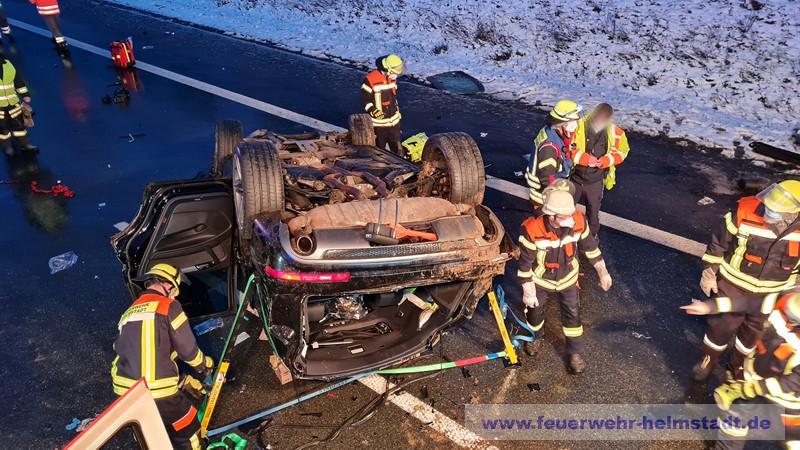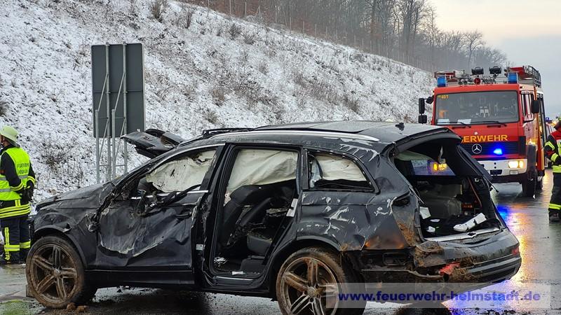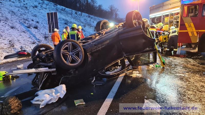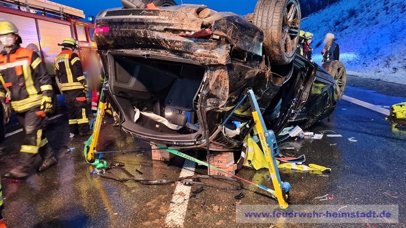 Auf der BAB 3 verunfallte ein Fahrzeug, eine Person wurde dabei im Fahrzeug eingeschlossen. Die Einsatzstelle wurde abgesichert und ausgeleuchtet. Das verunfallte Fahrzeug wurde stabilisiert und unterbaut. Mit hydraulischem Rettungsgerät wurde der Fahrer befreit.